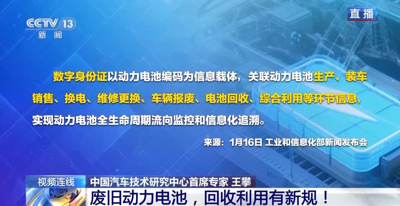 中国汽车技术研究中心首席专家 王攀:这“三个全”(全渠道、全链条、全生命周期)的提出也是体现了整个《管理办法》在制定过程中的一个核心理念,就是生产者责任延伸,加上全生命周期。相关生产者,包括电池的生产企业、新能源汽车的生产企业都需要履行自己的生产者责任延伸的相关义务。
