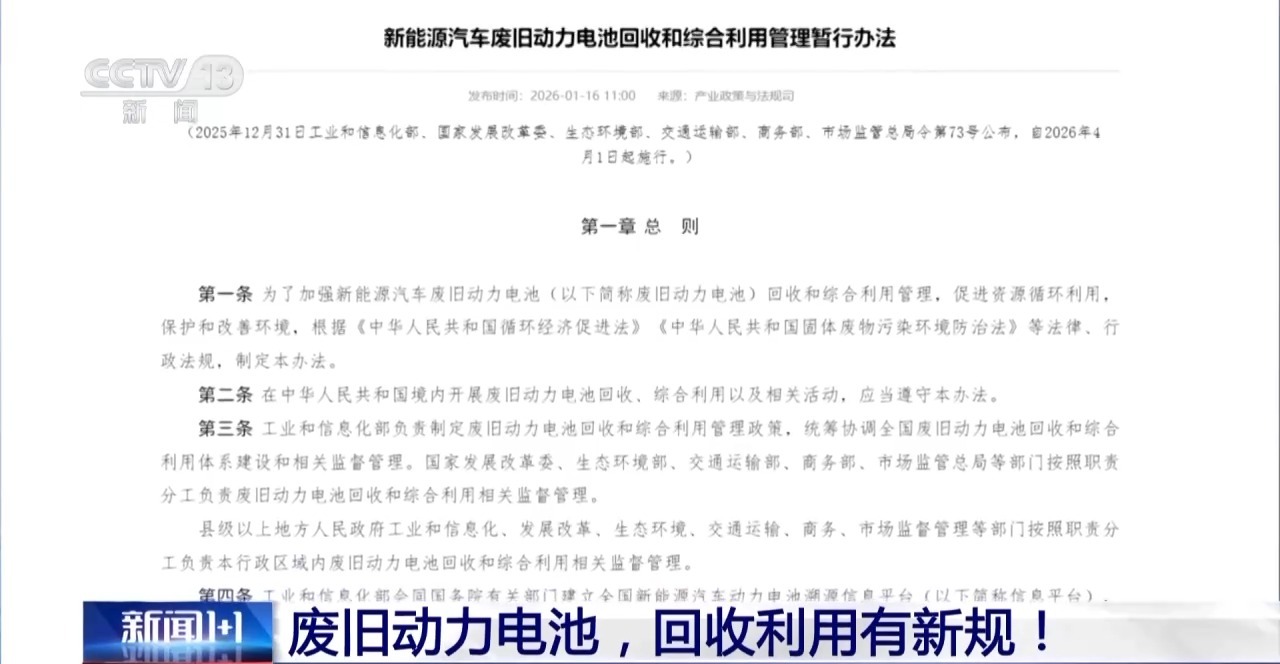 2025年新能源汽车的产销双双突破了1600万,同时新能源汽车废旧动力电池综合利用量超过了40万吨,五年后这个总量可能会超过100万吨。目前最早一批新能源汽车搭载的动力电池逐步进入到规模化“退役”阶段富才配资,我们的废旧动力电池回收和利用体系准备好了吗?1月16日,工信部联合6部门发布了《关于新能源汽车废旧电池回收和综合利用的管理办法》,它直击当下该行业的哪些痛点,会给我们回收利用的产业和企业带来怎样的影响。